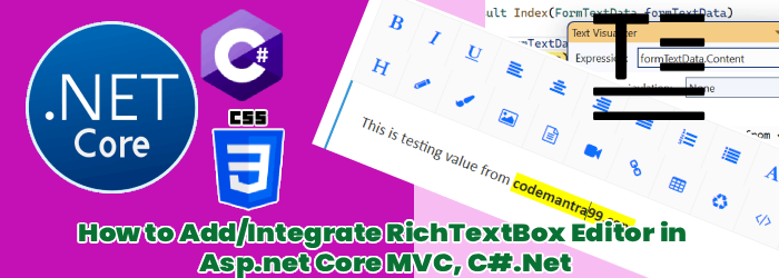 In above code I have passed the Model class as a parameter. One thing we need to check the name of TextAreaFor control name and the model class file property both are same. This will make us to get the user added value at controller end of RichTextbox at controller end. Now let's put a break point and check the output.Now let's add some value in click on submit value.